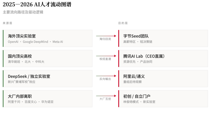 DeepSeek正在从人才“汇聚池”变成人才“出口商”。字节抢郭达雅,本质上是在通过购买“DeepSeek基因”来对冲自己的技术焦虑。而字节的Seed团队、腾讯的CEO办公室直属AI实验室,这些组织形态正在变得“去大厂化”:薪资透明度极低、资源配置极高、决策链条极短,以此来对抗林俊旸式的人才流失。