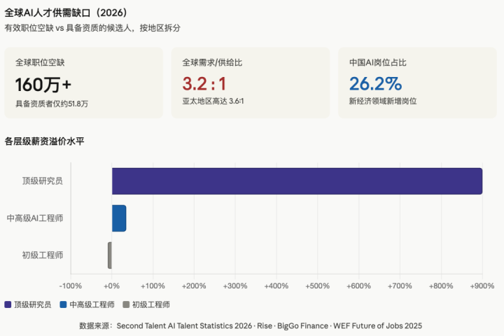 全球具备独立主导前沿AI研究能力的人才,存量不超过数千人,且短期内几乎无法通过教育体系快速补充。国内AI相关职位已占新经济领域新增岗位的四分之一以上,但AI岗位的供求比据业内机构估算仍低于全国平均水平。四家企业抢一个候选人,已成普遍现实。